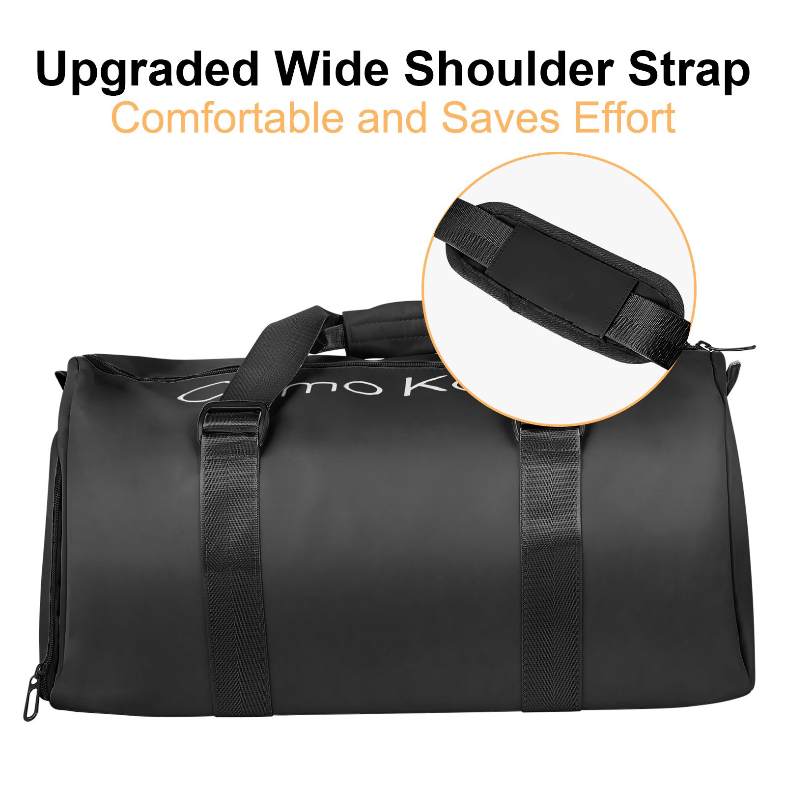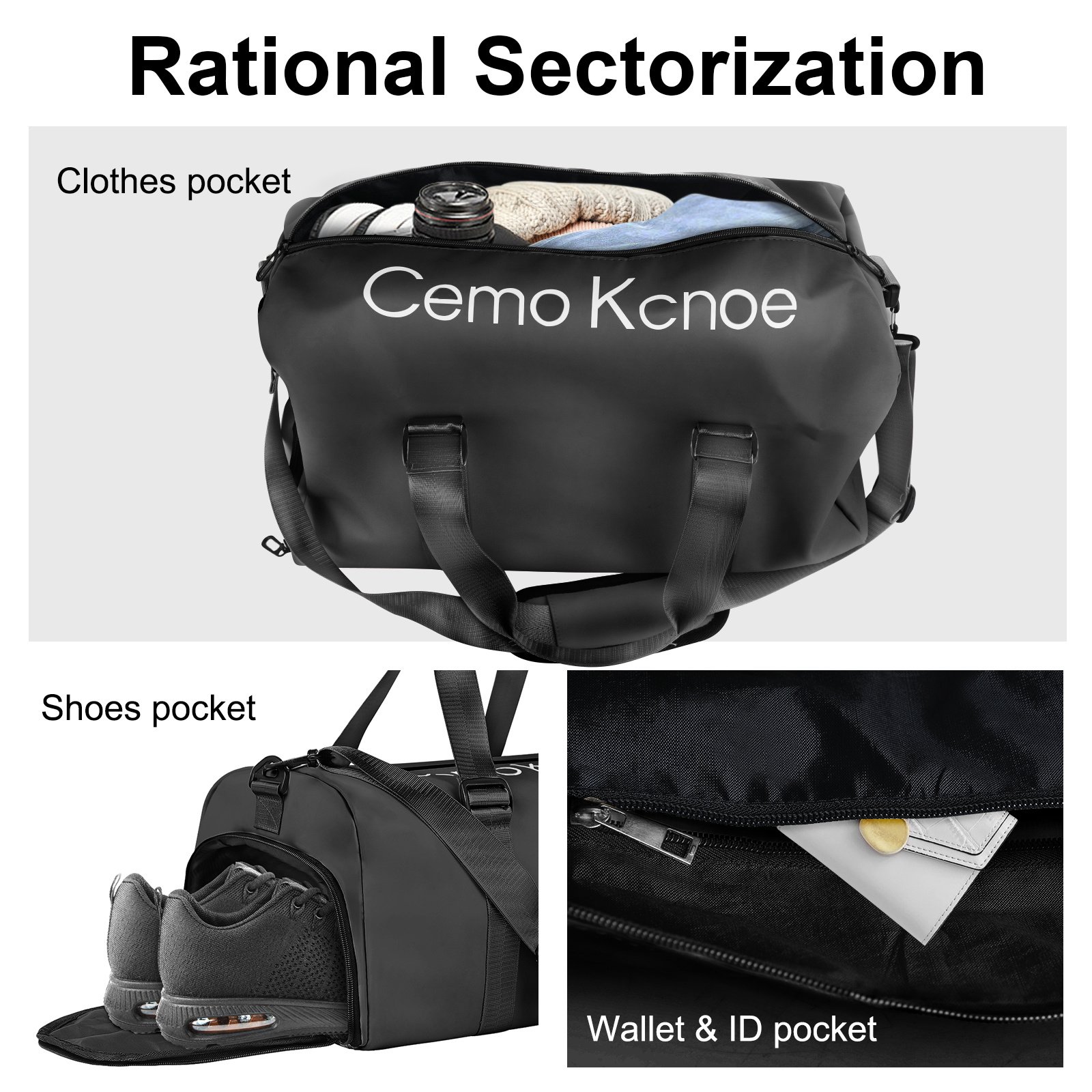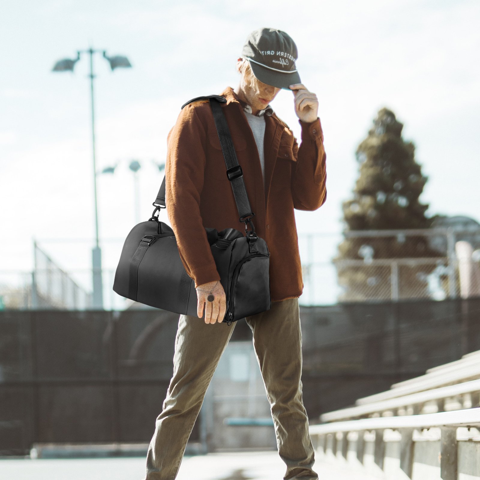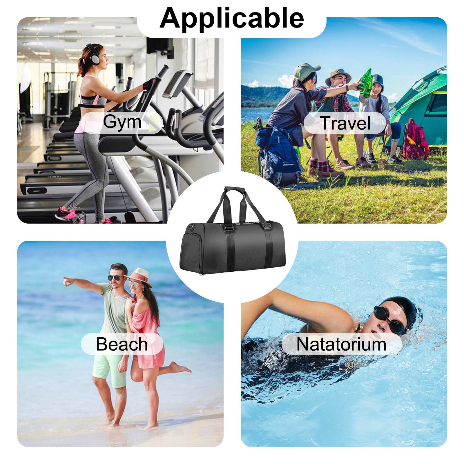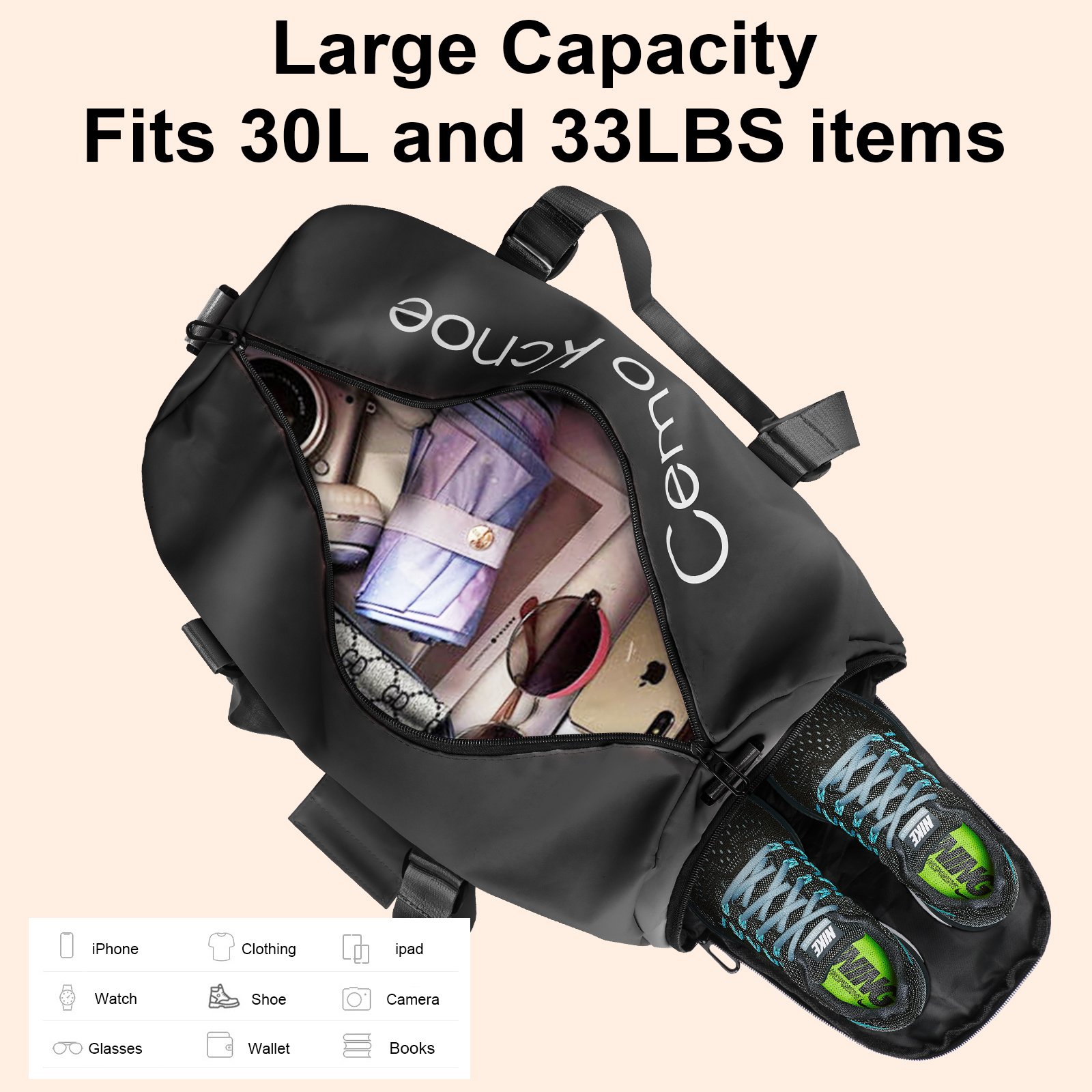 This waterproof duffel bag is great for sports, gyms and weekend getaway. With rational sectorization, the bag seperates compartments to store sneakers and clothes, and additional 3 storage pockets inside the bag. The bag is lightweight (1.14 LBS), yet the capacity is considerable large. Collapsible for storage when unused and unfolded to hold items up to 30 liters and 33 pounds. The leatherette fabric of the bag is soft, washable, waterproof, wrinkle-free, and wear-resistant. The adjustable shoulder strap is removable with buckles. You can hold the bag by hands, carry on one-shoulder, or cross the body. Use it as a gym bag, workout bag, sports bag, dance bag, overnight bag, carry on bag, or travel bag. Carry all your gym and travel essentials.